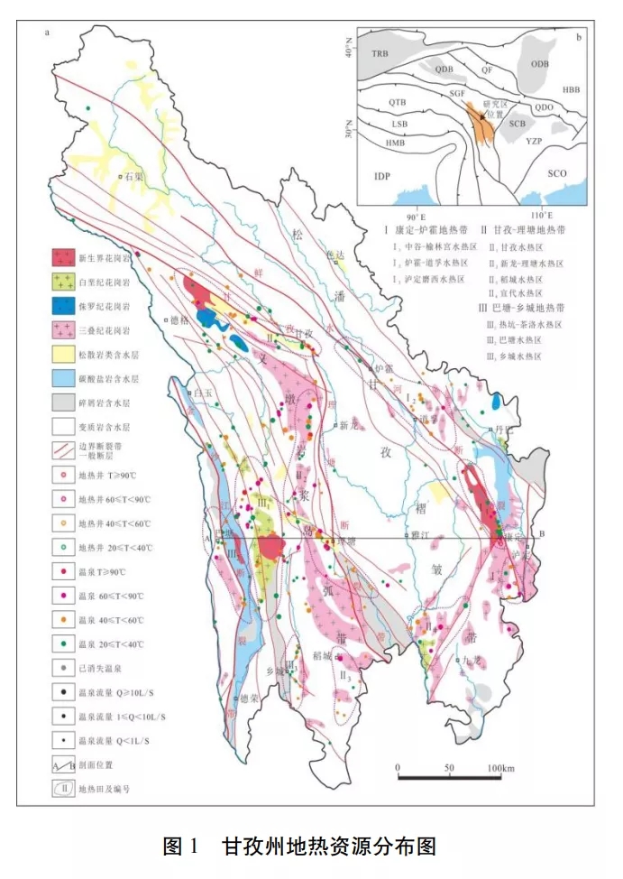 據(jù)最新調(diào)查成果,甘孜州的水熱活動(dòng)強(qiáng)烈,全州共有溫泉點(diǎn)264 個(gè),地?zé)峋?/a>17 口, 除色達(dá)縣外,其余17 縣均有水熱活動(dòng)。 全州溫泉分布主要受 3 條深大斷裂帶和數(shù)條主要大斷裂(德格-鄉(xiāng)城大斷裂帶、玉科大斷裂帶、 陳支大斷裂帶等)控制,形成了3個(gè)主要地?zé)釒?/a>和9個(gè)水熱活動(dòng)集中分布區(qū)的基本分布格局。水熱活動(dòng)強(qiáng)烈區(qū)一般位于主干斷裂帶及其轉(zhuǎn) 折的部位,以康定縣、甘孜縣、理塘縣、巴塘縣 為典型代表。